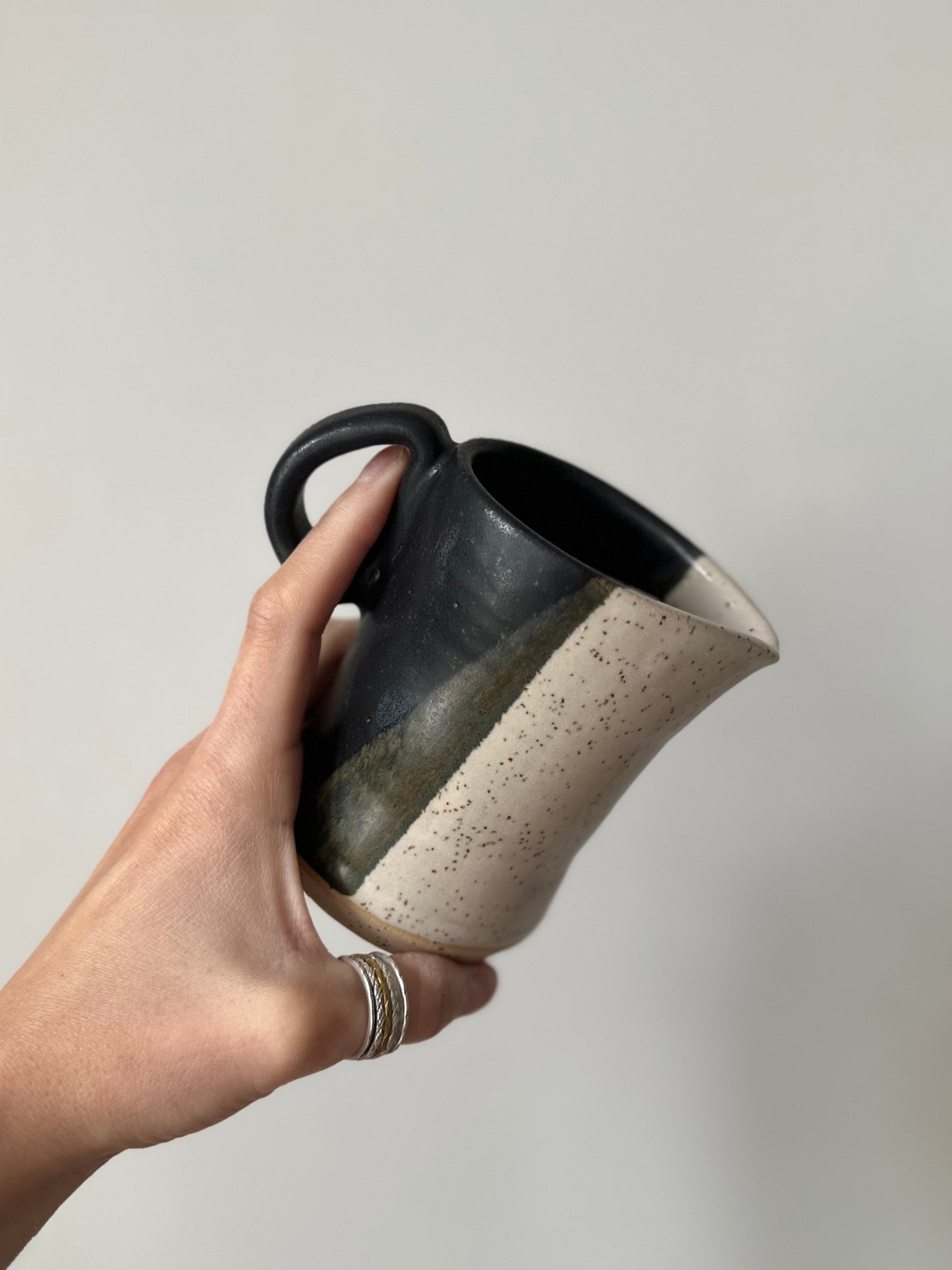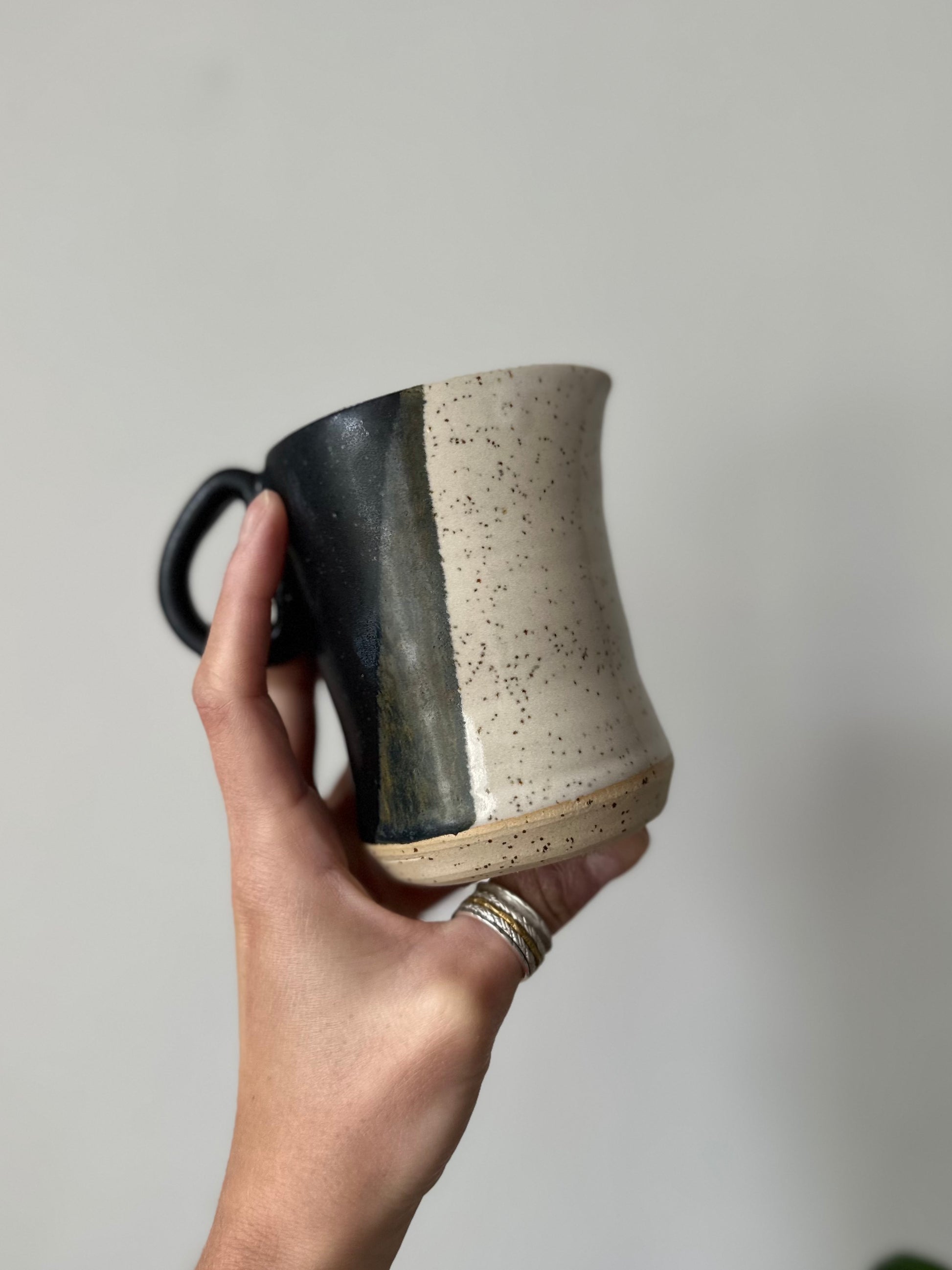 Inspired by the black sand beaches along the West coast of New Zealand. Speckled clay, white and black glaze.