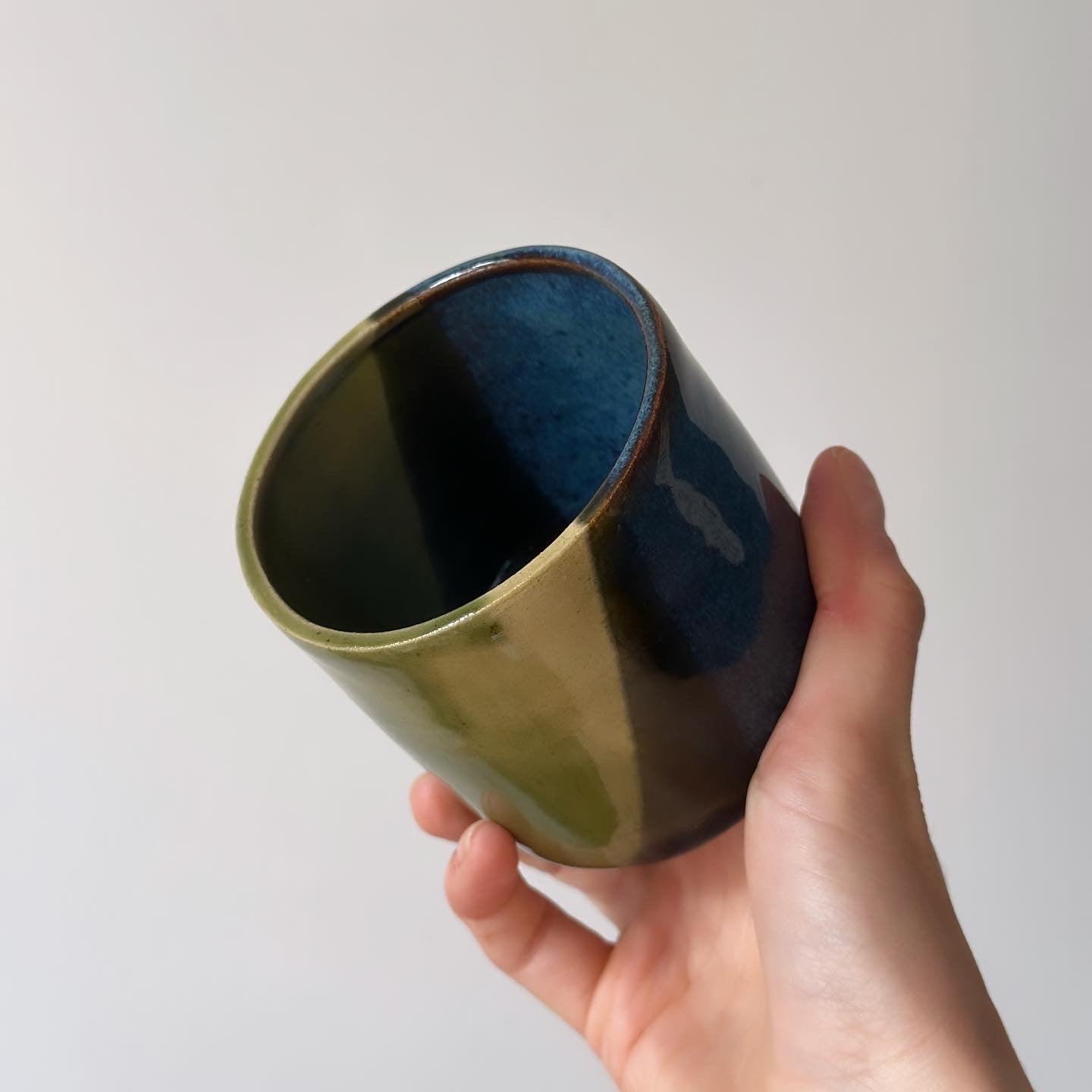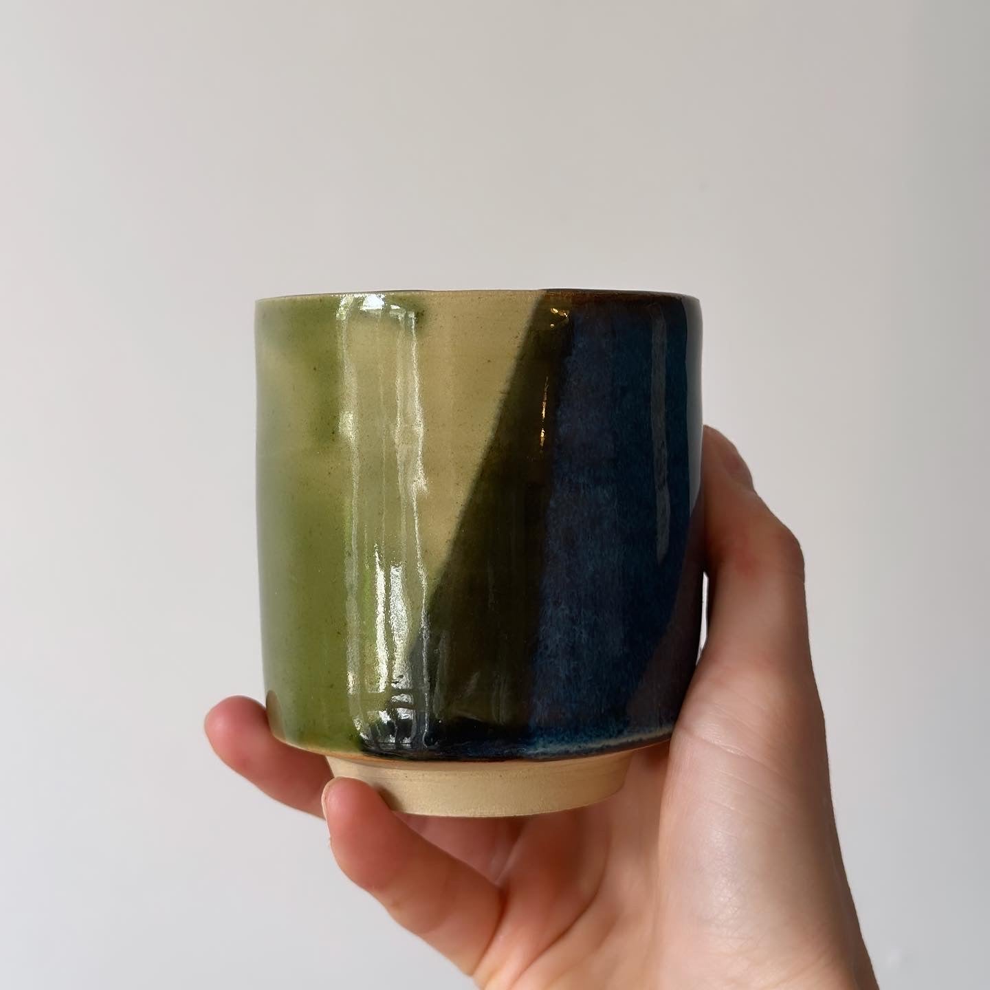 Standard stoneware clay. Raised footring. Dipped in forest green and dark blue glaze.