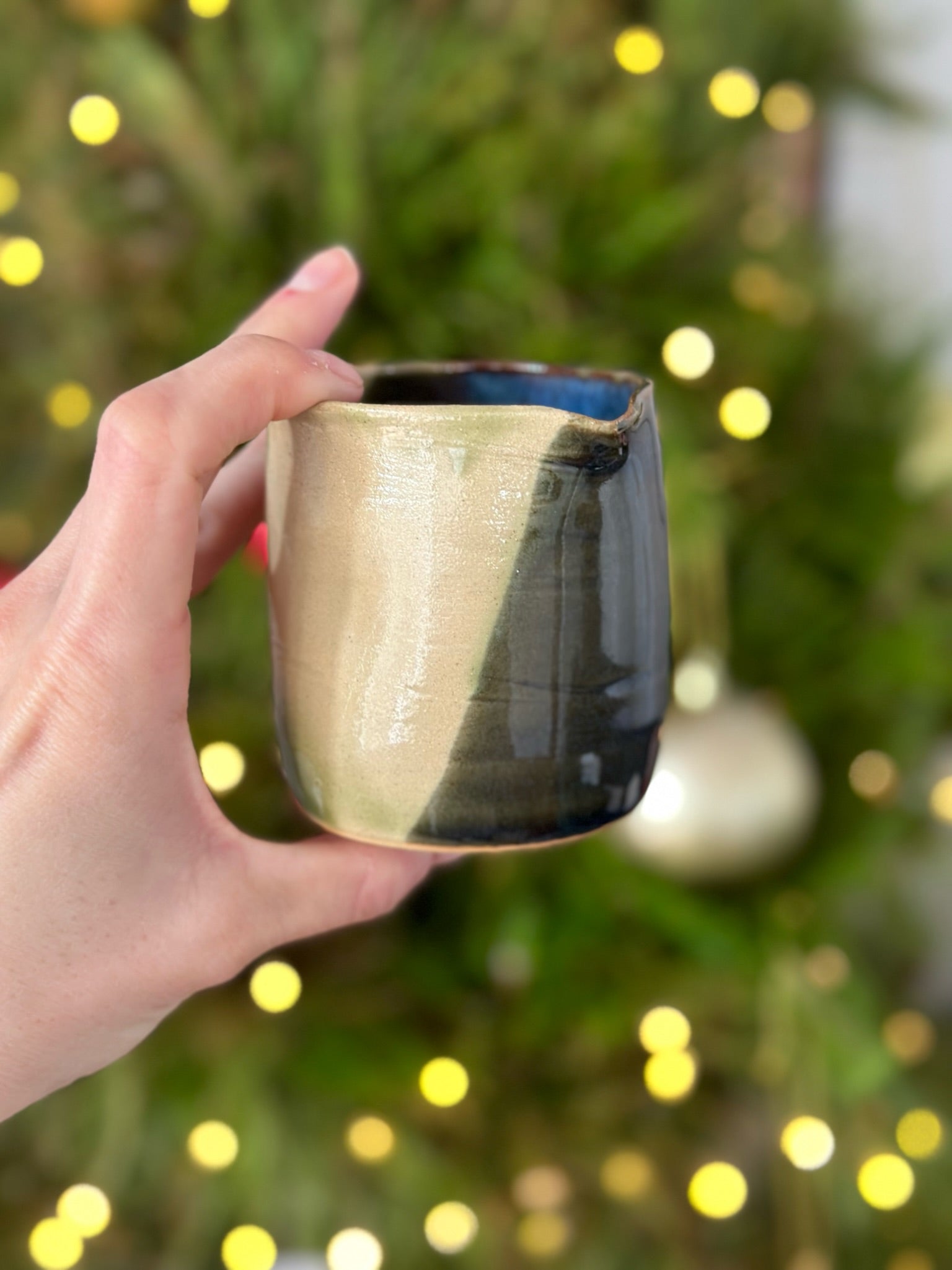 Standard stoneware. Dipped in forest green and dark blue glaze. Finger imprints added for grip.