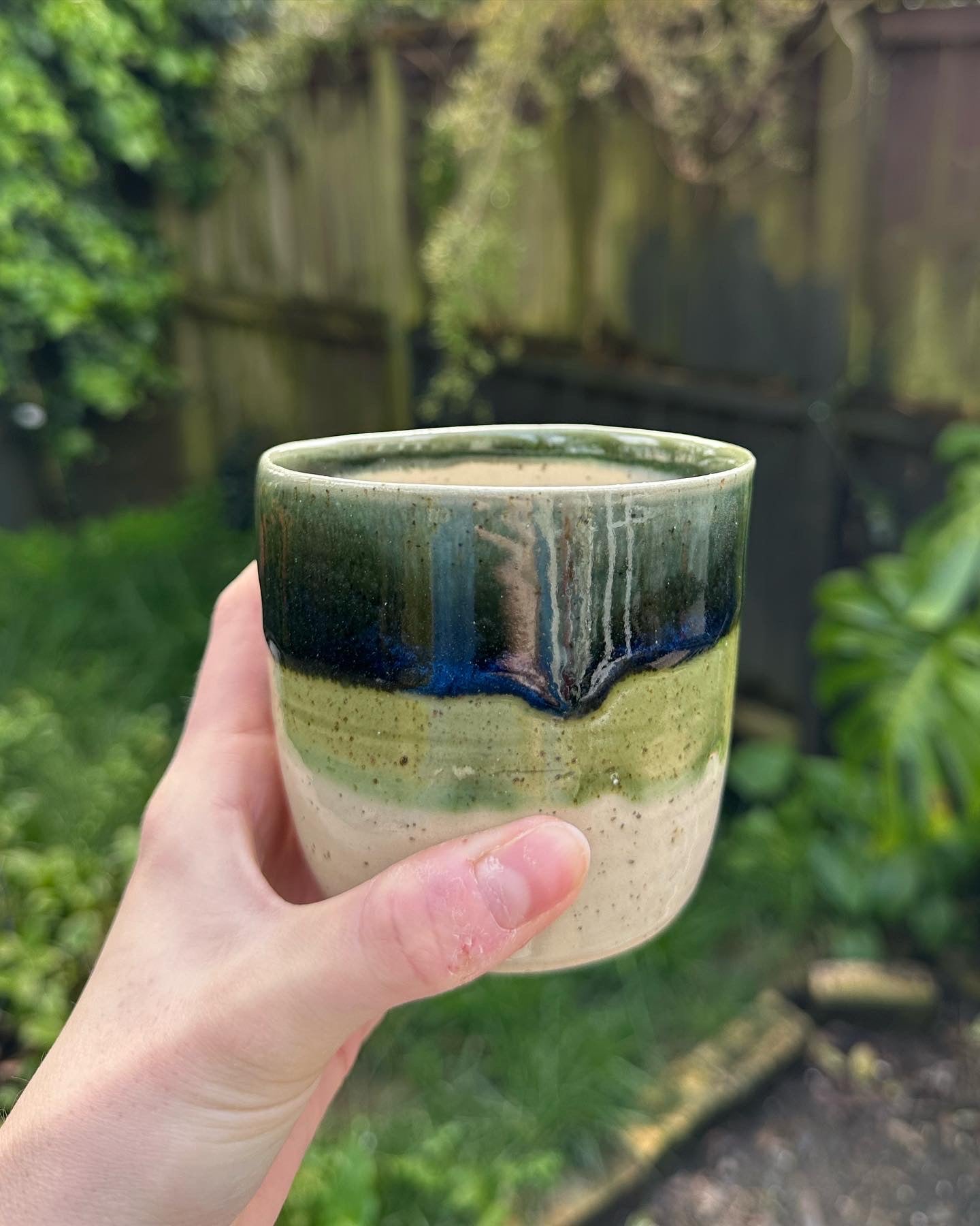 Speckled clay. Dipped in light green and dark blue glaze. Slight sparkle effect to the blue glaze once fired.
