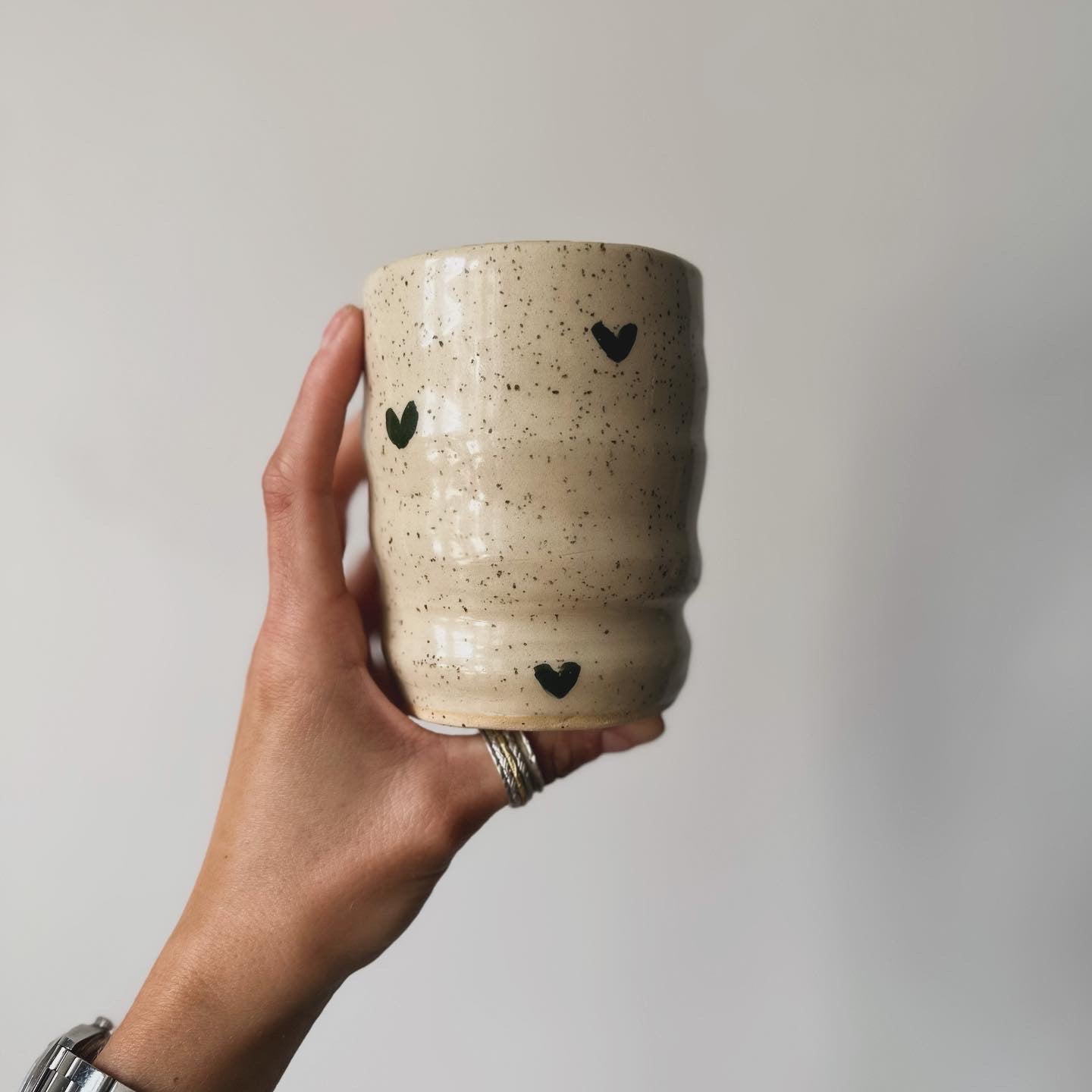 Large heart tumbler. Using speckled clay, green underglaze and a clear glaze finish.