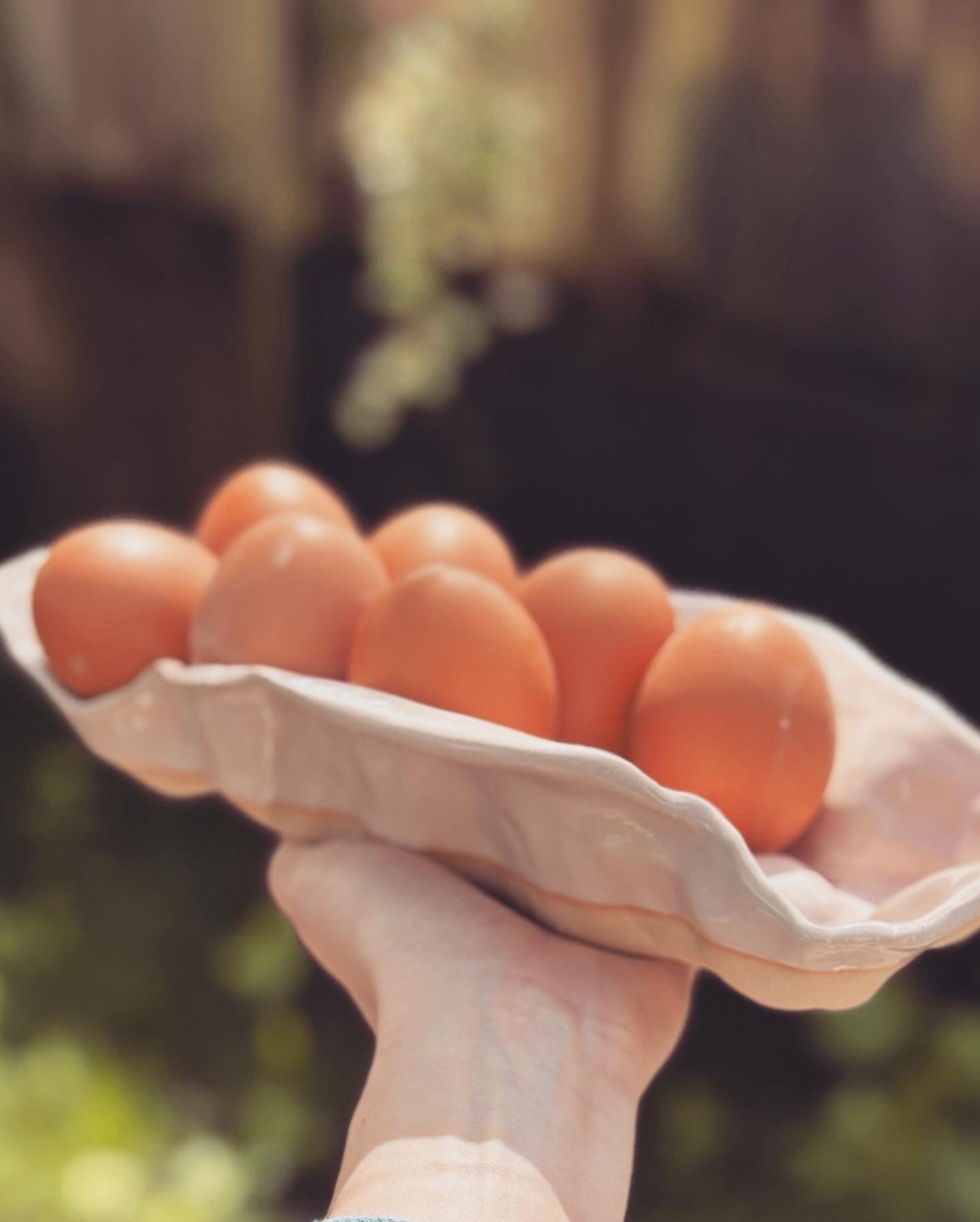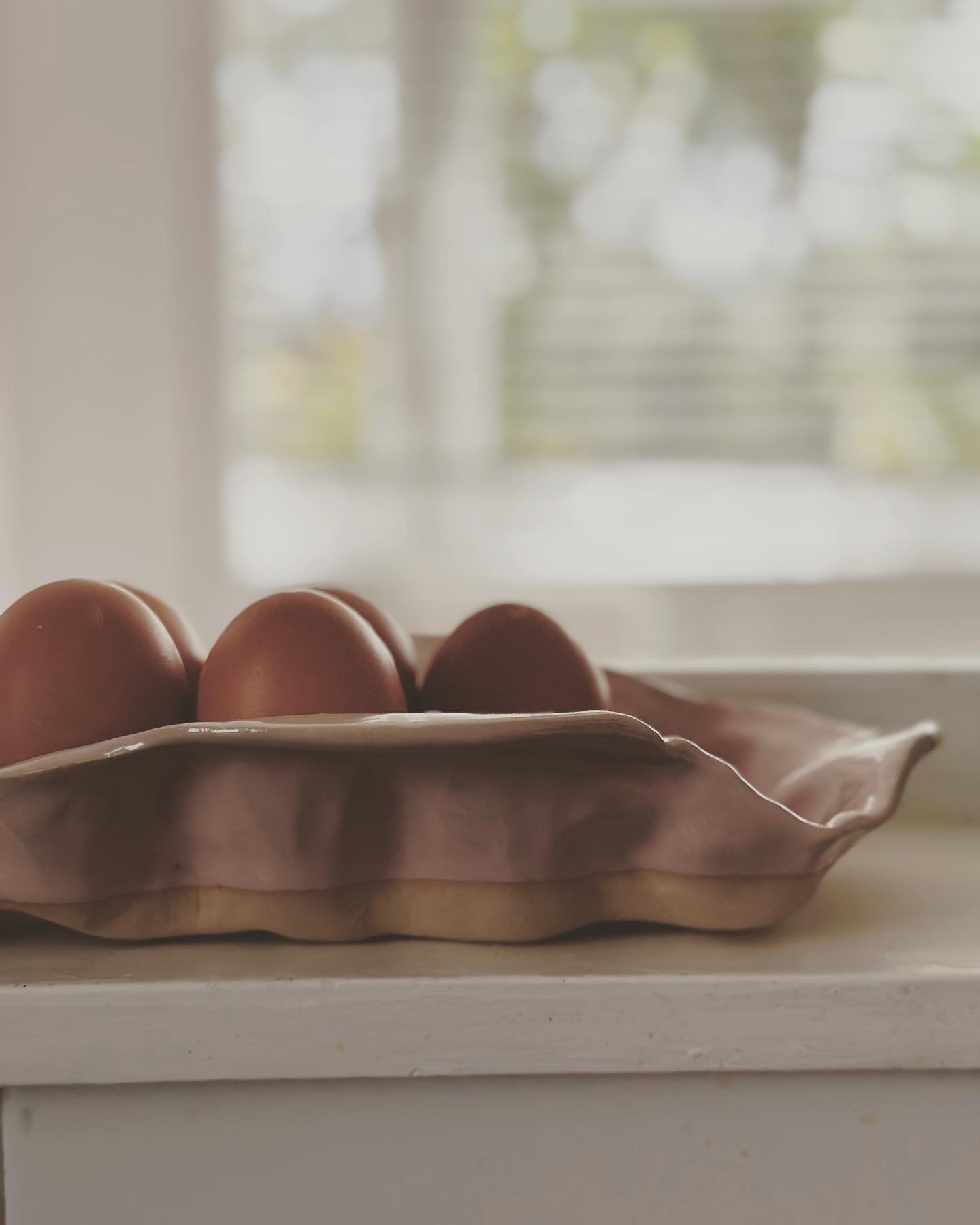 Standard stoneware clay. Handmade instead of wheel-thrown. Pink glaze.